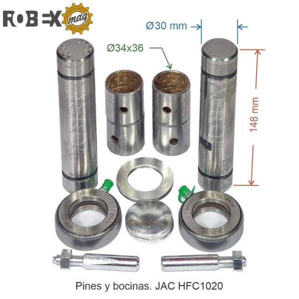 El kit de pines y bocinas viene completo, con dos pines, cuatro bocinas, dos rodamientos, dos seguros y otros elementos que lo completan.